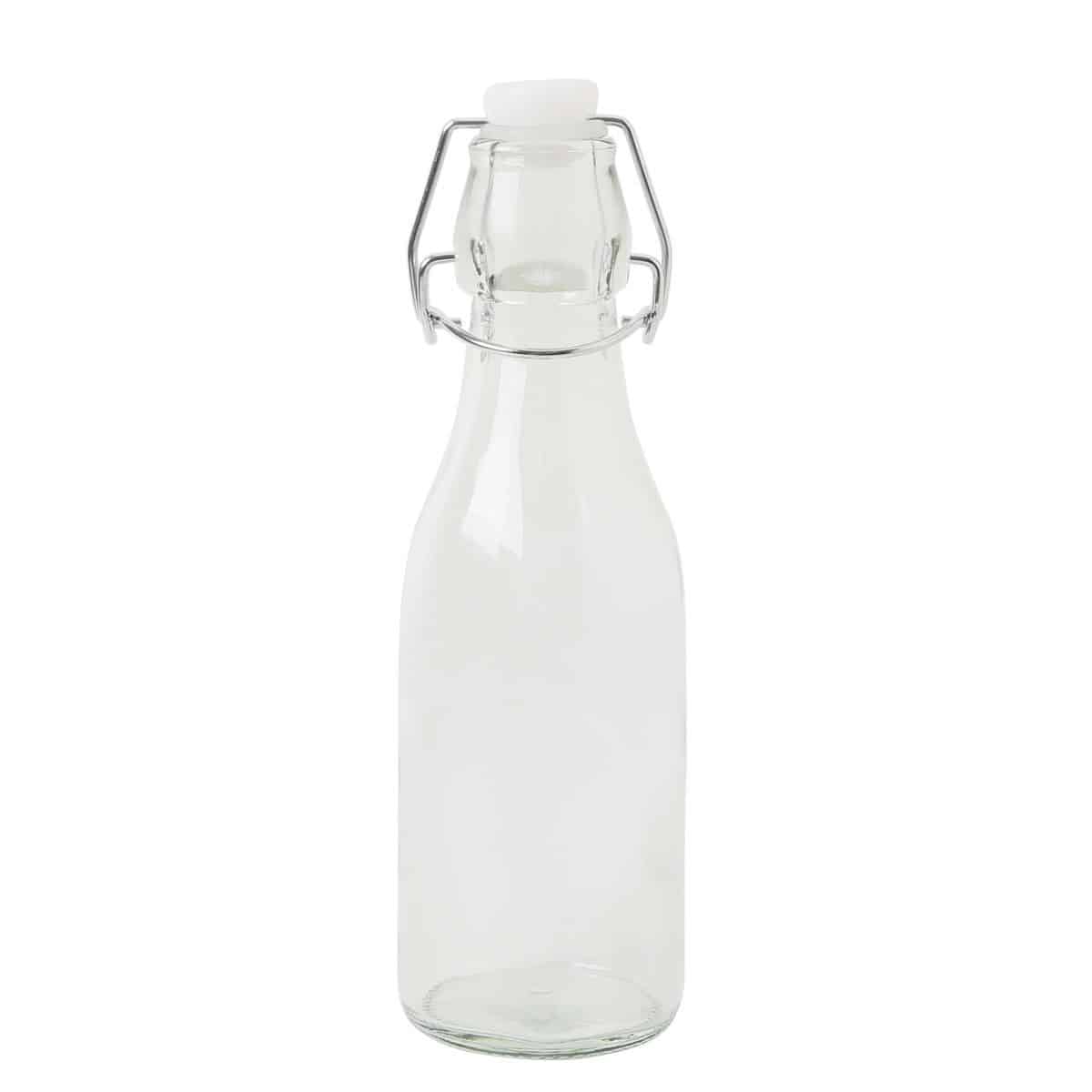 Saftflaske på 0,25 liter med patentlukning. For at forhindre glasset i at revne, skal glasset forvarmes med varmt vandt inden det kan steriliseres med kogende vand.