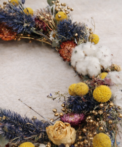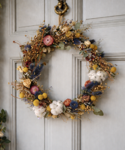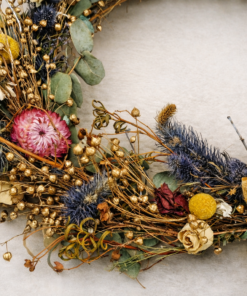 Skab en varm og hyggelig stemning med en smuk, håndbundet krans af tørrede blomster. Kransen har et naturligt, rustikt udtryk med fine farvekontraster i blå, gul og gylden – og den er lige så flot på hoveddøren som inde i hjemmet – Kransen er håndbundet og helt unik!