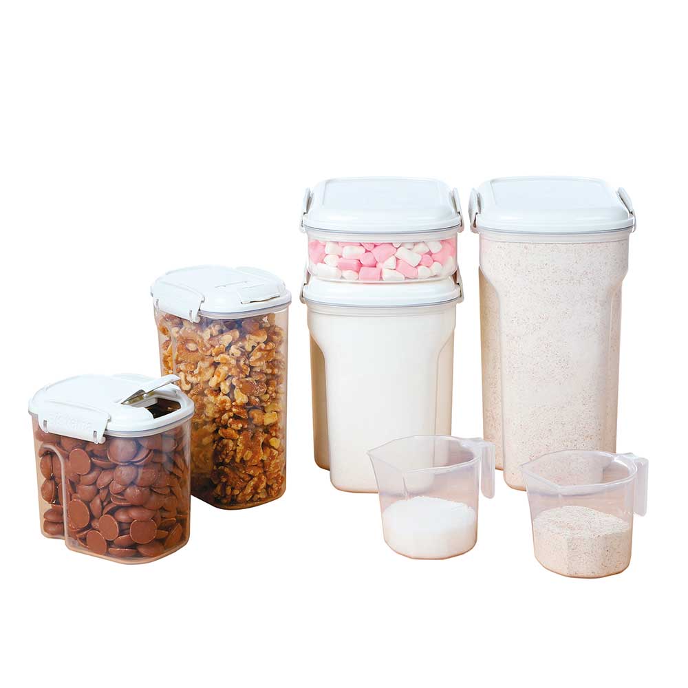 Med BAKE IT opbevaringsbokse får du et alsidigt og praktisk sæt, der gør det nemt at organisere og opbevare dine madvarer. Dette sæt består af 9 dele, herunder 6 forskellige opbevaringsbokse og 3 måleskeer, som alle er designet til at gøre din hverdag lettere.